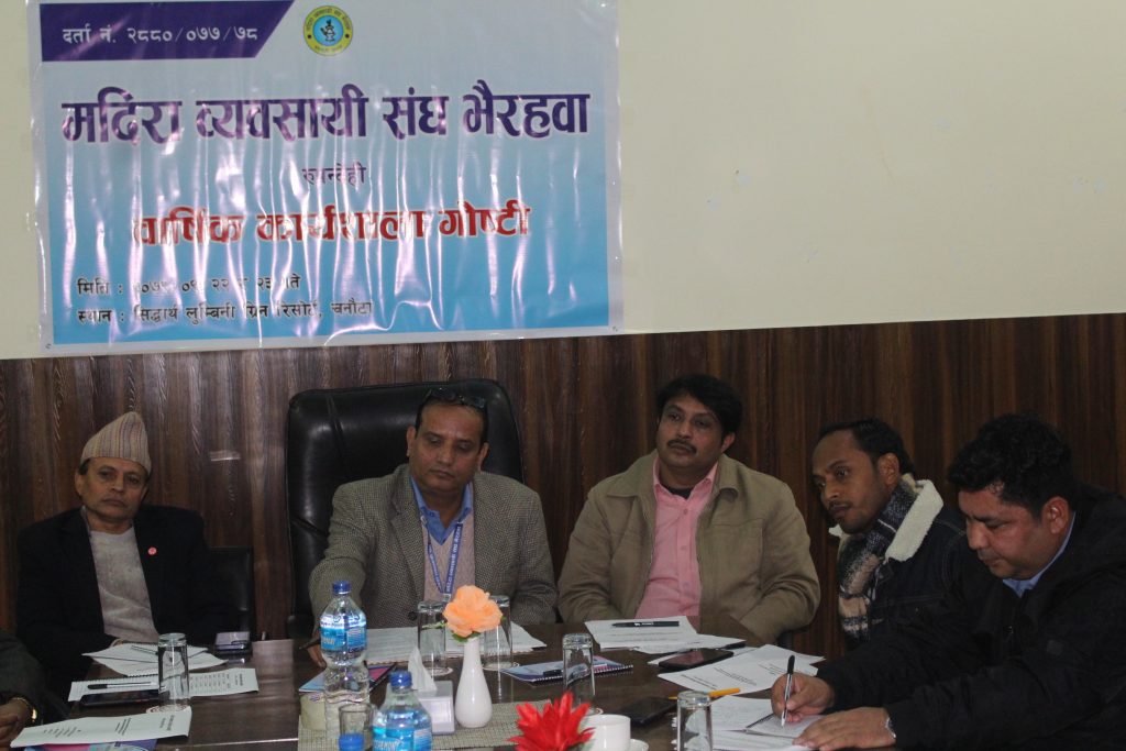 मदिरा व्यवसायी संघ भैरहवा, रुपन्देहीका अध्यक्ष केशवराज ज्ञवालीको अध्यक्षता, वरिष्ठ उपाध्यक्ष बाबुराम पाण्डेको स्वागत तथा महासचिव केशव कुंवरको सञ्चालनमा सम्पन्न कार्यक्रममा होटल तथा रेष्टुरेण्ट व्यवसायी महासंघ–नेपालका उपमहासचिव राजेश महोत्रा, मदिरा व्यवसायी संघ भैरहवाका सल्लाहकार खिमबहादुर खत्री, ठाकुरकुमार श्रेष्ठ, मृगेन्द्र गोविन्द श्रेष्ठ लगायतको आतिथ्यता रहेको थियो । मदिरा व्यवसायी संघ, भैरहवामा हाल १६१ जना सदस्य रहेको उपाध्यक्ष भागीरथ पाण्डेले जानकारी दिए ।