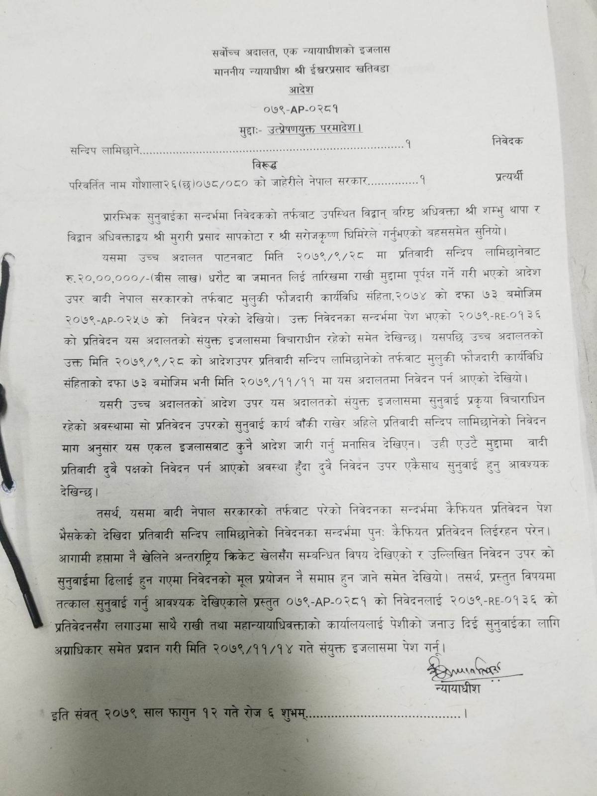 थप आदेशमा भनिएको छ, ‘यसमा वादी नेपाल सरकारको तर्फबाट परेको निवेदनका सन्दर्भमा कैफियत प्रतिवेदन पेश भैसकेको देखिदा प्रतिवादी सन्दीप लामिछानेको निवेदनका सन्दर्भमा पुनः कैफियत प्रतिवेदन लिइरहन परेन । आगामी हप्तामा नै खेलिने अन्तर्राष्ट्रिय क्रिकेट खेलसँग सम्बन्धित विषय देखिएको र उल्लिखित निवेदन उपर को सुनुवाइमा ढिलाइ हुन गएमा निवेदनको मूल प्रयोजन नै समाप्त हुन जाने समेत देखियो। तसर्थ, प्रस्तुत विषयमा तत्काल सुनुवाइ गर्नु आवश्यक देखिएकाले प्रस्तुत ०७९-AP-०२८१ को निवेदनलाई २०७९-RE-०१३६ को प्रतिवेदनसँग लगाउमा साथै राखी तथा महान्यायाधिवक्ताको कार्यालयलाई पेशीको जनाउ दिई सुनुवाइका लागि अग्राधिकार समेत प्रदान गरी मिति २०७९/११/१४ गते संयुक्त इजलासमा पेश गर्नू ।’