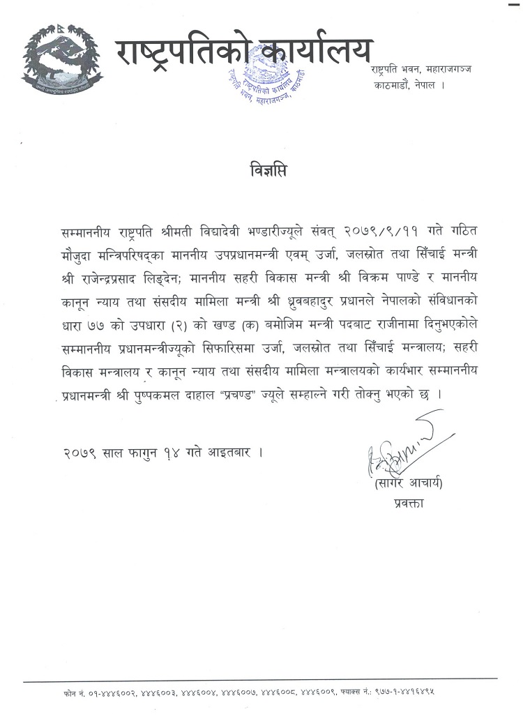 राष्ट्रपति विद्यादेवी भण्डारीले प्रधानमन्त्रीको सिफारिसमा आज विभिन्न तीन मन्त्रालयको कार्यभार प्रधानमन्त्रीले नै सम्हाल्ने गरी तोक्नुभएको राष्ट्रपति कार्यालयले निकालेकाे विज्ञप्तिमा उल्लेख छ ।