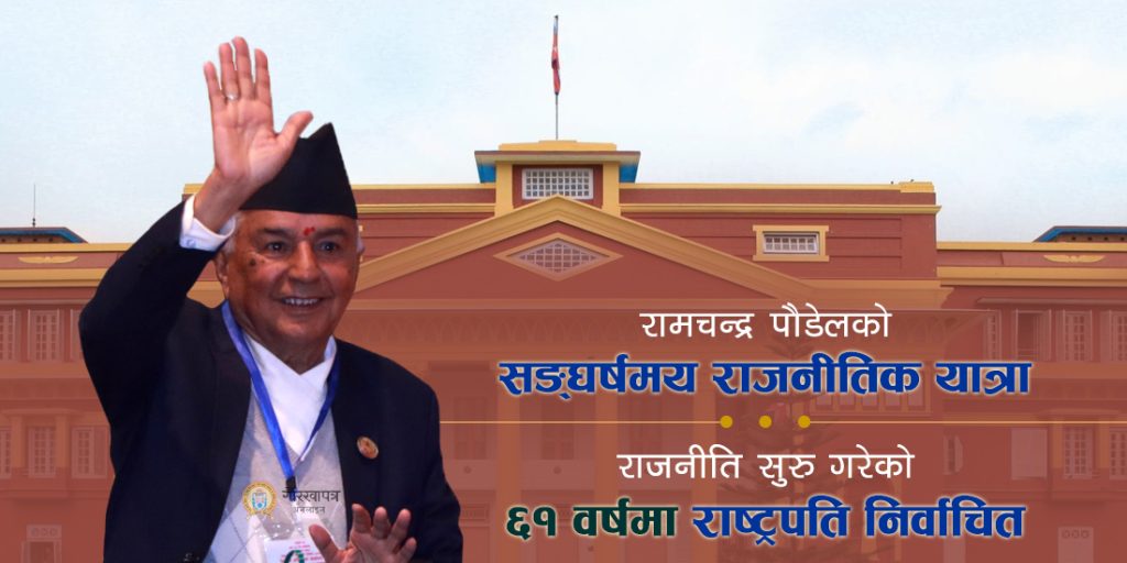 काठमाडौं, फागुन २५ गते। प्रजातान्त्रीक योद्ध नेपाली कांग्रेसका वरिष्ठ नेता रामचन्द्र पौडेल राष्ट्रपतिमा निर्वाचित हुनुभएको छ। प्रजातान्त्रिक आन्दोलनका क्रममा पटकपटक गरेर १४ वर्ष जेल जीवन बिताउनुभएका पौडेल गणतन्त्र नेपालको चौंथो राष्ट्रपति बन्नुभएको हो। लोकतन्त्रका लागि कोही कसैसँग सम्झौता नगर्नुभएका पौडेलको सङ्घर्ष र राजनीतिक उचाईको सम्मान भएको छ। उहाँ आठ राजनीतिक दलका दर्ताबाट साझा उम्मेदवार बनेर राष्ट्रपति निर्वाचित हुनुभएको हो।