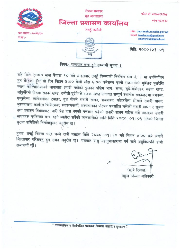 तनहुँका प्रमुख जिल्ला अधिकारी छवि रिजालले निकाल्नुभएको सूचनामा बिहान ५ बजेदेखि साँझ ५ बजेसम्म राजमार्गमा समेत गाडी चलाउन नपाइने उल्लेख छ । पृथ्वी राजमार्ग हुँदै तनहुँ कटेर अन्त जाने यात्रुहरुले आइतबार बिहान ५ बजेअघि वा बेलुका ५ बजेपछि मात्रै यात्रा गर्नुपर्नेछ ।