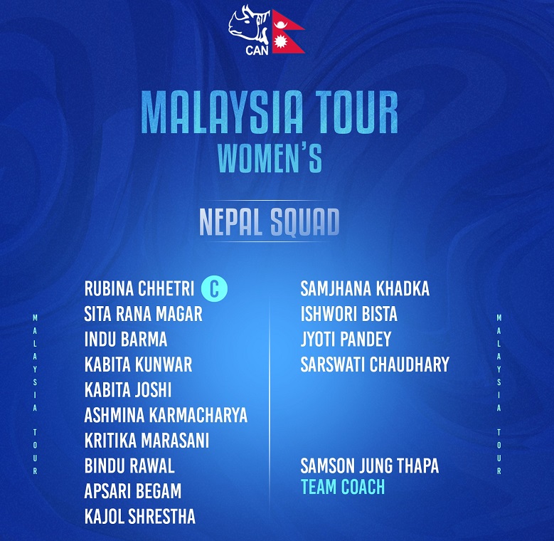 सम्झना खड्का, कृतिका मरासिनी र ईश्वरी विष्ट पहिलो पटक राष्ट्रिय टोलीमा परेका छन् । नेपालले रुविना क्षेत्रीको कप्तानीमा १४ जना रहेको टोली घोषणा गरेको हो । नेपालले मलेसियामा पहिलो खेल जेठ १५, दोस्रो खेल जेठ १६, तेस्रो खेल जेठ १८, चौथो खेल जेठ २० र पाँचौँ तथा अन्तिम खेल जेठ २१ गते खेल्नेछ ।