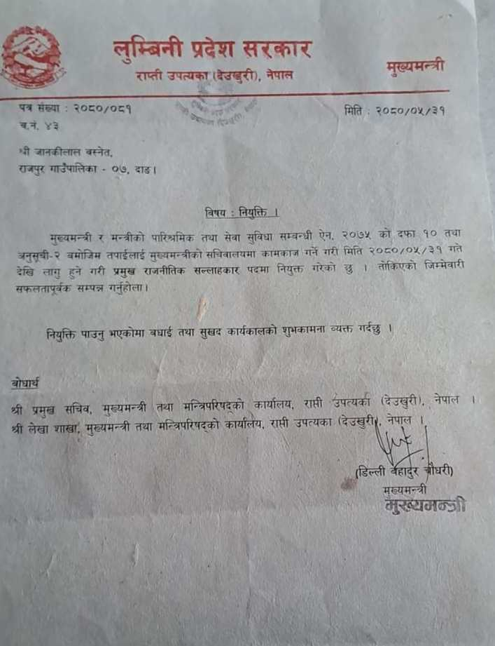 मुख्यमन्त्री चौधरीकाे राजनीतिक सल्लाहकारमा बस्नेत