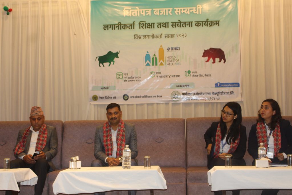 भैरहवा, २१ असोज । विश्व लगानीकर्ता सप्ताहको अवसर पारेर नेपाल धितोपत्र बोर्ड र स्टक ब्रोकर्स एशोसिएसन अफ नेपालको आयोजना तथा आर्यतारा इन्भेष्टमेन्ट एण्ड सेक्युरिटिज प्रा.लि. ब्रोकर नं. ५७ को ब्यवस्थापनमा धितोपत्र बजारसम्बन्धि लगानीकर्ता शिक्षा तथा सचेतना कार्यक्रम भैरहवामा सम्पन्न भएको छ ।