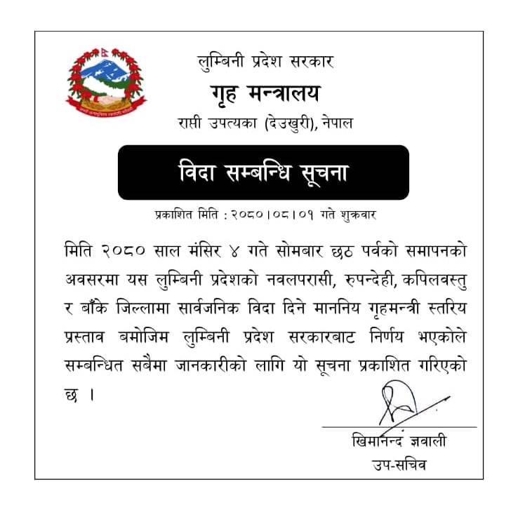 २०८० मंसिर ४ गते सोमबार नवलपरासी, रुपन्देही, कपिलवस्तु र बाँके जिल्लामा सार्वजनिक विदा दिने निर्णय भएको लुम्बिनी प्रदेश सरकारका प्रवक्ता तथा गृहमन्त्री सन्तोष कुमार पाण्डेयले बताए ।