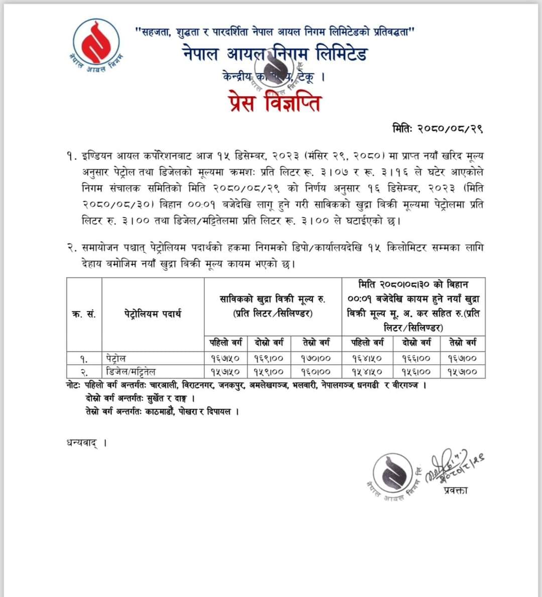 शुक्रबार एक विज्ञप्ति जारी गर्दै निगमले पेट्रोल, डिजेल र मट्टितेलमा प्रतिलिटर ३र३ रुपैयाँ घटाइएको जानकारी दिएको छ।