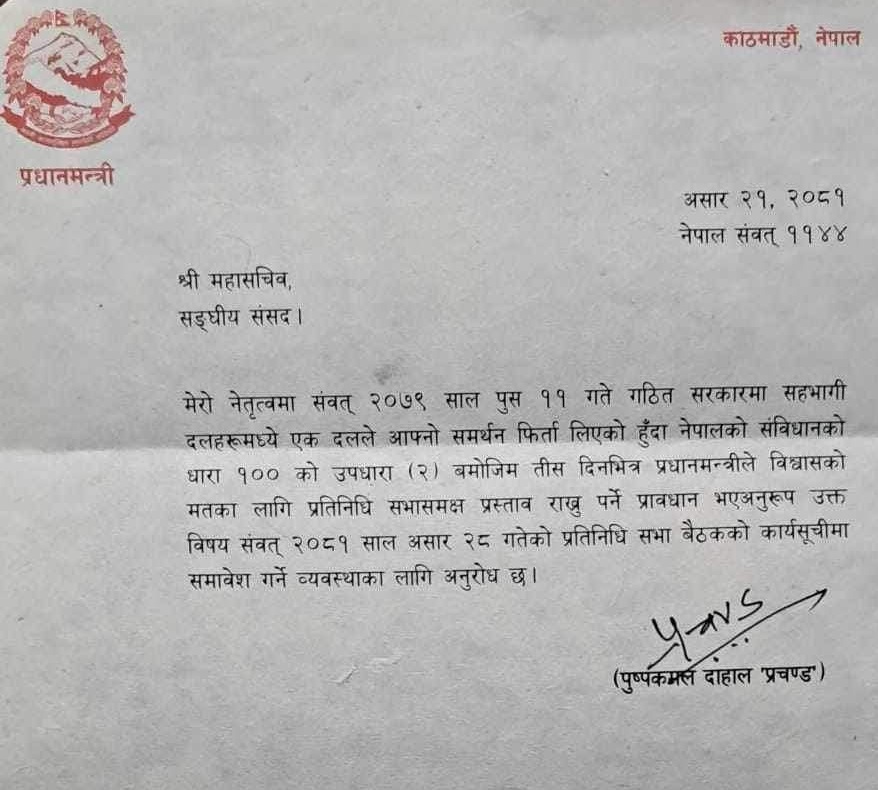 असार २८ गते प्रधानमन्त्री प्रचण्डले विश्वास मत लिनुहुने