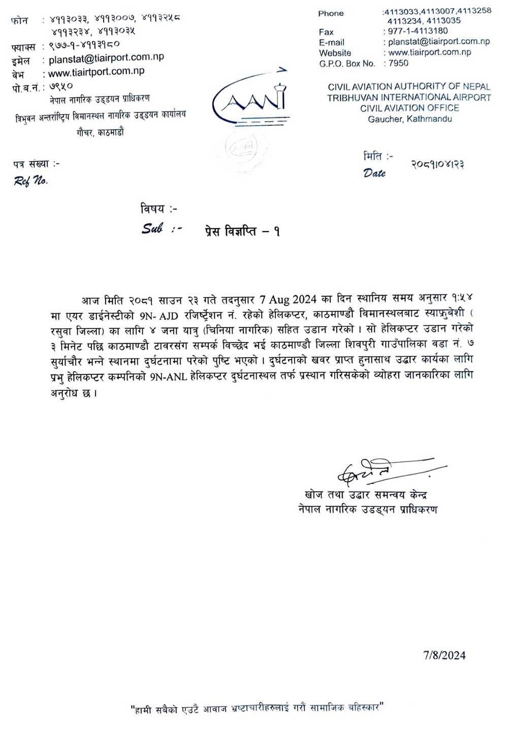 दुर्घटना लगत्तै उद्धारका लागि प्रभु हेलिकप्टर कम्पनीको (९ एन–एएनएल) हेलिकप्टर दुर्घटनास्थलमा पुगेको छ ।
