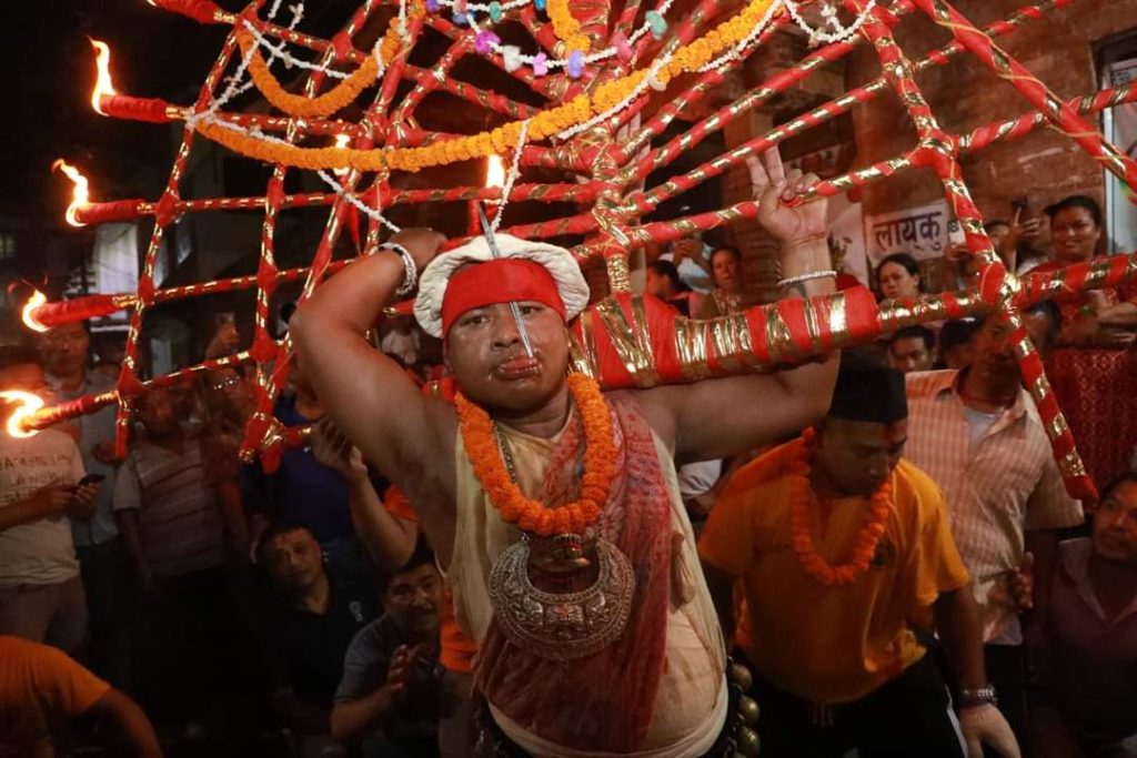 दिगु भैरव मन्दिरको डबलीमा जिब्रो छेडेर नगर परिक्रमा गर्दै