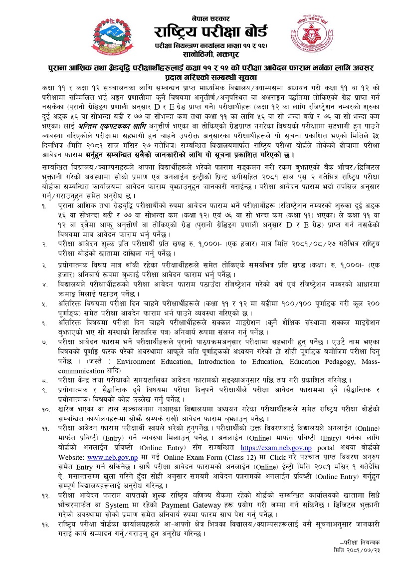 राष्ट्रिय परीक्षा बोर्डले आज सूचना निकालेर पुराना आंशिक तथा ग्रेडवृद्धि परीक्षार्थीलाई कक्षा ११ र १२ को परीक्षा आवेदन फाराम भर्न सूचित गरेको छ । बोर्डले यस्ता विद्यार्थीलाई आउँदो मङ्सिर २७ गतेभित्रमा आफूले अध्ययन गरेको शैक्षिक संस्थामा गएर परीक्षा फाराम भर्न अनुरोध गरेको छ । कक्षा १२ का लागि रजिस्ट्रेसन नम्बरको शुरुका दुई अङ्क ५६ वा त्योभन्दा बढी र ७७ वा त्योभन्दा कम तथा कक्षा ११ का लागि ५६ वा त्योभन्दा बढी र ७६ वा त्योभन्दा कम भएकालाई अन्तिम एक पटकको मौका दिइने छ ।