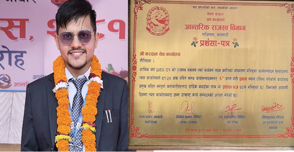 उक्त प्रशंसा पत्र उप प्रधानमन्त्री एवम् अर्थमन्त्री विष्णुप्रसाद पौडेलले कार्यालय प्रमुख एवम् कर अधिकृत भिम प्रसाद सापकोटालाई प्रदान गर्नु भएको हो ।