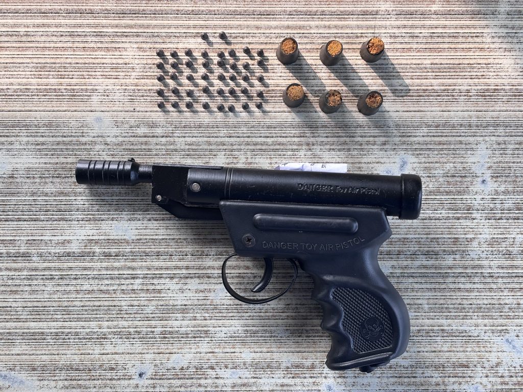उनको शरीरमा कम्मरको भागमा लुकाई छिपाई अवस्थामा राखेको कालो रङ्गको ४.५ मिलि मिटर क्यालिवरको डेन्जर टोय ईयर पेस्तोल १ थान, पेस्तोलमा लाग्ने छर्रा ४३ थान, पेस्तोलमा प्रयोग हुने धमाका ६ थान, आइटेल कम्पनीको मोबाईल १ थान र एक थान सिमकार्ड सहित नियन्त्रणमा लिईएको उहाँले बताउनुभयो ।