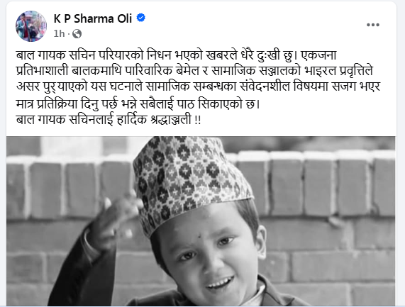 काठमाण्डौ – प्रधानमन्त्री केपी शर्मा ओलीले आज निधन भएका बालगायक सचिन परियारलाई श्रद्धाञ्जली दिनुभएको छ ।