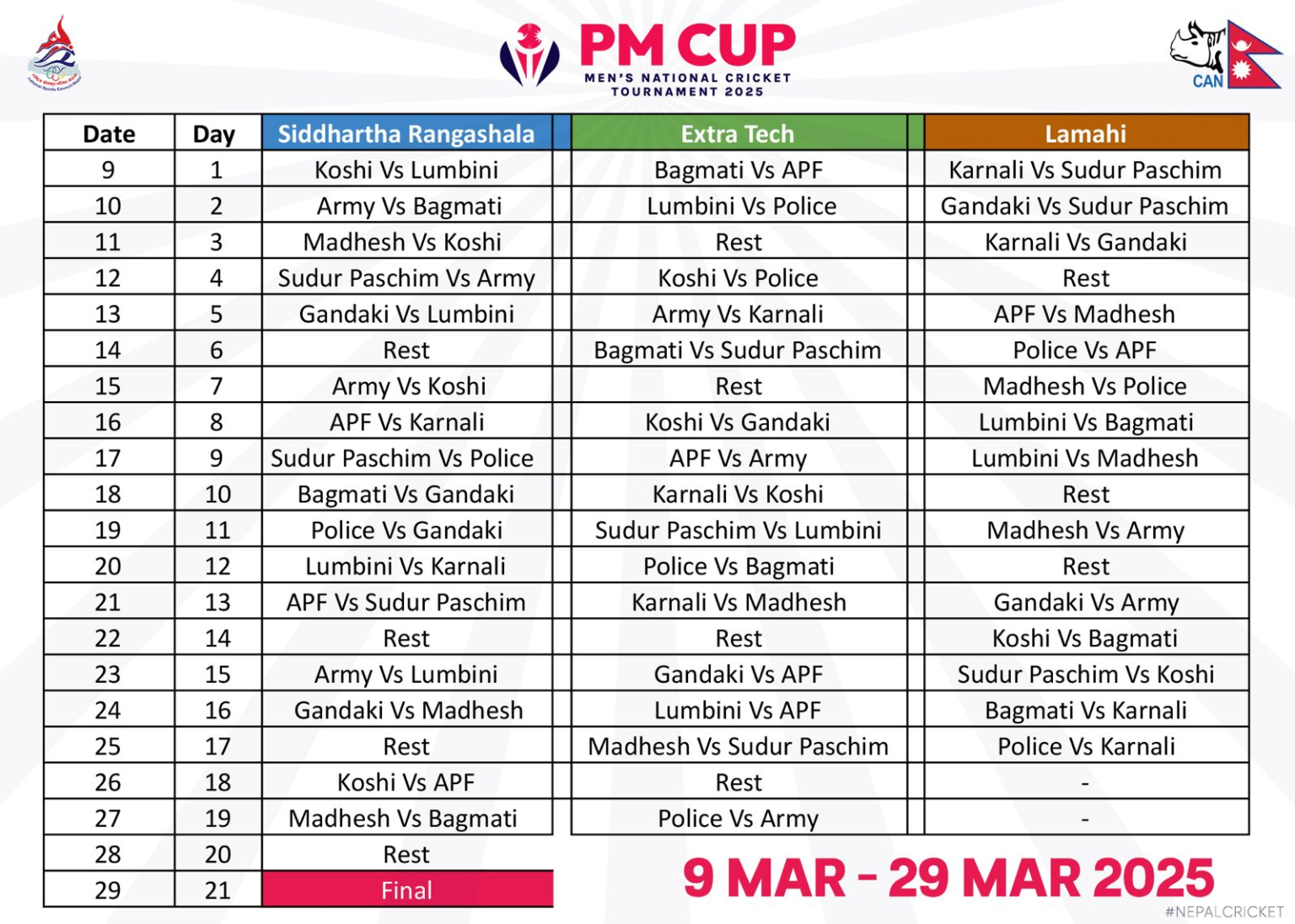 प्रधानमन्त्री कपको खेल तालिका सार्वजनिक
