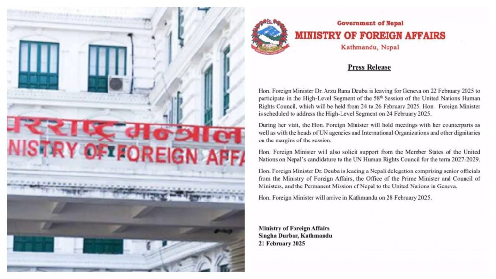 परराष्ट्र मन्त्रालयले आज एक विज्ञाप्ति मार्फत संयुक्त राष्ट्र संघको मानव अधिकार परिषदको ५८ औं उच्चस्तरीय बैठकमा सहभागी हुन परराष्ट्रमन्त्री राणा त्यसतर्फ प्रस्थान गर्न लाग्नु भएको जानकारी गराएको हो ।
