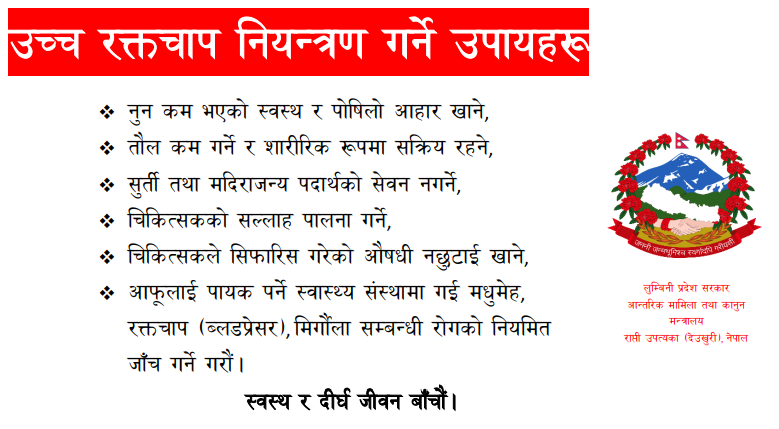 कपिलबस्तु, चैत २२ गते । स्वास्थ्य कार्यालय कपिलबस्तुको आयोजनामा संक्रामक तथा नसर्ने रोग न्यूनिकरण सम्बन्धि अभिमुखिकरण, सचेतिकरण तथा अन्र्तक्रिया कार्यक्रम सम्पन्न भएको छ । कार्यक्रमका सहभागीहरूलाई नसर्ने रोगसम्बन्धी जानकारी तथा तिनको न्यूनिकरणका उपायहरूबारे जानकारी गराइएको थियो ।