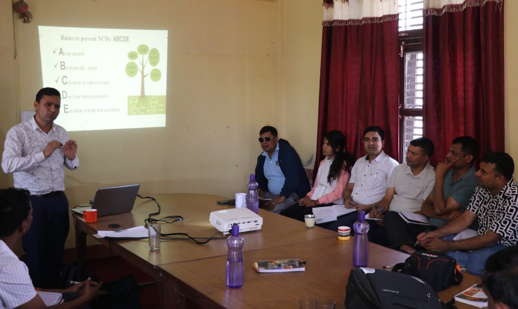 कार्यक्रममा नसर्ने रोगहरूको विषयमा स्वास्थ्य कार्यालयका रतनलाल शर्माले सहजीकरण गर्दै रोगहरूको कारण, प्रभाव र न्यूनीकरणका उपायहरूबारे जानकारी गराएका थिए । शर्माले खानपान, जीवनशैली, तथा मानसिक स्वास्थ्यले नसर्ने रोगहरूमा पार्ने असरबारे सहभागीलाई समेत जानकारी गराएका थिए ।