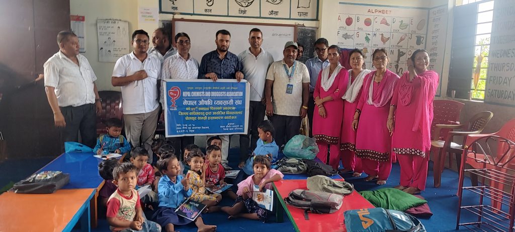 औषधि व्यवसायी सङ्घको ५२ औँ स्थापना दिवस अवसरमा बालबालिकालाई सामग्री वितरण