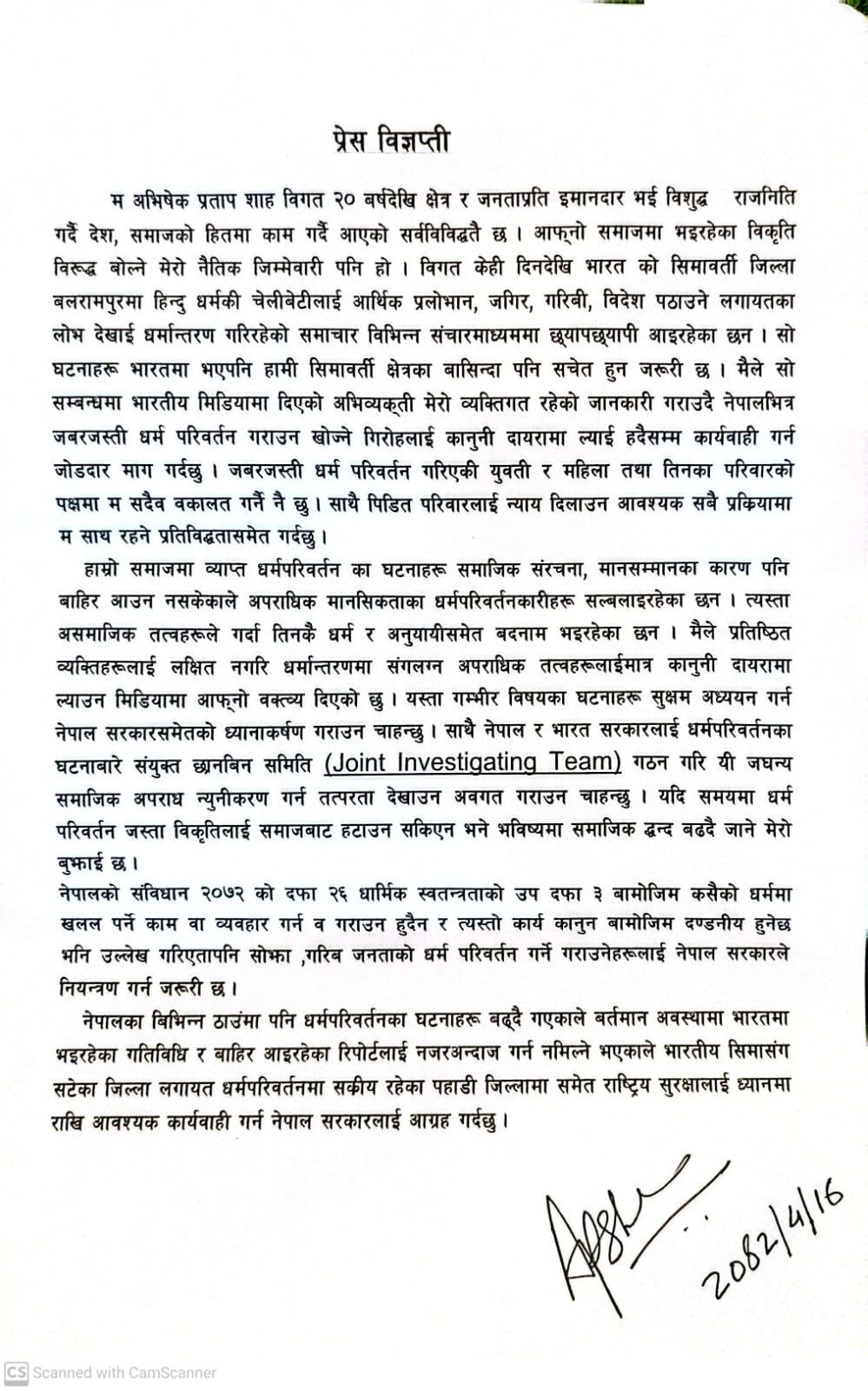 कपिलवस्तु, साउन १६। नेपाली कांग्रेसका नेता एवं पूर्व सांसद अभिषेक प्रताप शाहले भारत–नेपाल सीमा क्षेत्रमा बढ्दै गइरहेका जबरजस्ती धर्म परिवर्तनका घटनाप्रति चिन्ता व्यक्त गर्दै नेपाल सरकारलाई कडा कदम चाल्न आग्रह गरेका छन्। शाहले पछिल्ला दिनमा भारतीय सीमावर्ती जिल्ला बलरामपुरमा हिन्दू धर्मका महिलाहरूलाई विभिन्न प्रलोभन देखाई धर्म परिवर्तन गराइएको विषयमा भारतीय सञ्चारमाध्यममा दिएका अभिव्यक्तिलाई व्यक्तिगत विचार बताएका छन्।