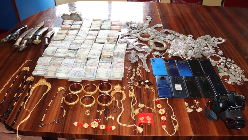 त्यसैगरी सुन जस्तो देखिने पहेँलो धातुका कडा ६ थान, घाँटीमा लगाउने हार २ थान, सिक्री ३ थान, कानमा लगाउने बाली १ थान, कानमा लगाउने झुम्का ३ जोडी, औँठी ४ थान, टप १ जोडी, सिक्रीको लकेट २ थान, नाकको फुली १ थान, रिङ सानो ६ थान, सिरबन्दी २ थान, तिलहरी २ थान, मङ्गलसुत्र ५ थान, पहेँलो धातु जञ्जिर २ थान बरामद गरिएको सूचना अधिकारी पातलीले जानकारी दिनुभयो ।
