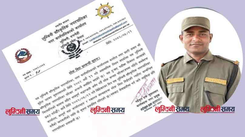 लुम्बिनी, भदौ ११ गते । रुपन्देहीको लुम्बिनी साँस्कृतिक नगरपालिकामा कार्यरत नगर प्रहरी जवान सुहेल अहमद मुसलमानको निधनप्रति गहिरो दुःख व्यक्त गर्दै एक दिनको शोक विदा घोषणा गरिएको छ ।