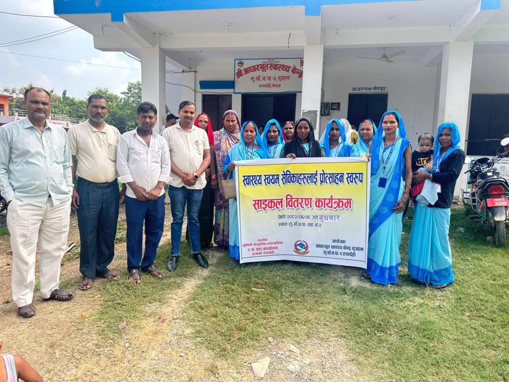 लुम्बिनी, असोज ९ गते । रुपन्देहीको लुम्बिनी सांस्कृतिक नगरपालिका–२ मा स्वास्थ्य स्वयंसेविकाहरुलाई प्रोत्साहनस्वरूप साइकिल वितरण कार्यक्रम सम्पन्न भएको छ।