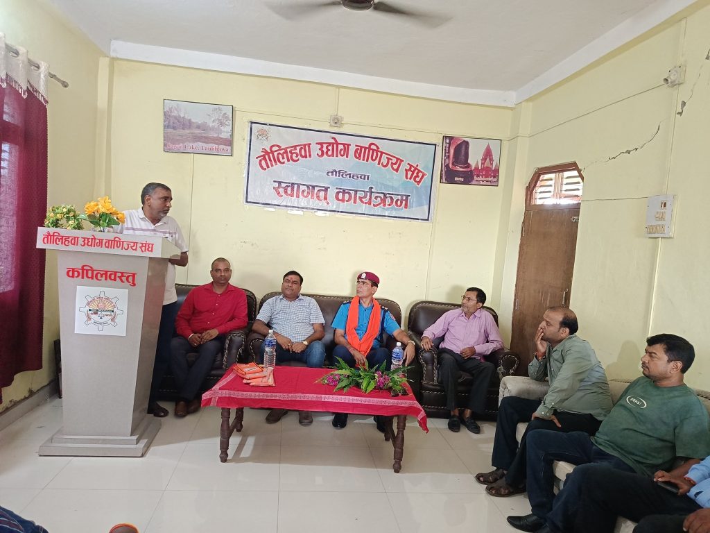 कपिलवस्तु । हालै जिल्ला प्रहरी कार्यालयमा सरुवा भई आउनु भएको प्रहरी उपरिक्षक सन्तोष आचार्यलाई तौलिहवा उद्योग वाणिज्य संघले स्वागत गरेको छ । संघले आयोजना गरेको स्वागत कार्यक्रममा अध्यक्ष गयादिन कुर्मी, वरिष्ठ उपाध्यक्ष सन्दिप श्रीवास्तव, कोषाध्यक्ष बृजेश भटरा लगायत उद्योगी व्यवसायीहरूको सहभागिता रहेको थियो ।
