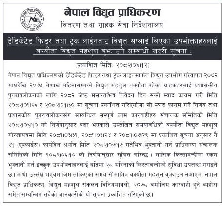 काठमाण्डौ – नेपाल विद्युत प्राधिकरणले डेडिकेटेड फिडर र ट्रङ्कलाइनमार्फत विद्युत् उपभोग गरेका तर अहिलेसम्म भुक्तानी नगरेका उद्योगीलाई बक्यौता बुझाउन आउँदाे कात्तिक १७ सम्मको समय दिएको छ । २०७२ साल माघदेखि २०७५ वैशाखसम्मको बक्यौता विद्युत् महशुल भुक्तानी गर्न प्राधिकरणले निर्देशन दिएको हो ।