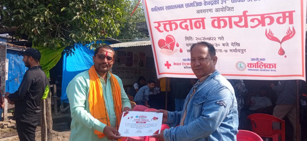 कपिलवस्तु । कपिलवस्तुको सिमवर्ती क्षेत्र यशोधरा गाउपालिका वडा नम्बर ७ मर्यादपुरमा रक्तदान कार्यक्रम संपन्न गरिएको छ । नेपाल रेडक्रस सोसाईटी कपिलवस्तुको सहयोग र कालिका स्वालम्बन सामाजिक केन्द्रको आयोजनामा रक्तदान गरिएको हो ।