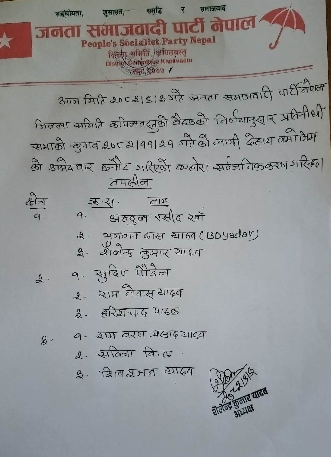 कपिलबस्तु । जनता समाजवादी पार्टी नेपाल जिल्ला कार्यसमिति कपिलबस्तुले प्रतिनिधि सभाका लागि उम्मेदवारको छनौट गरेको छ । तौलिहवामा जिल्ला कार्यसमितिको बैठकबाट ३ वटै निर्वाचन क्षेत्रका लागि नाम सिफारिस गरिएको जिल्ला अध्यक्ष शैलेन्द्र कुमार यादवले बताउनुभयो ।