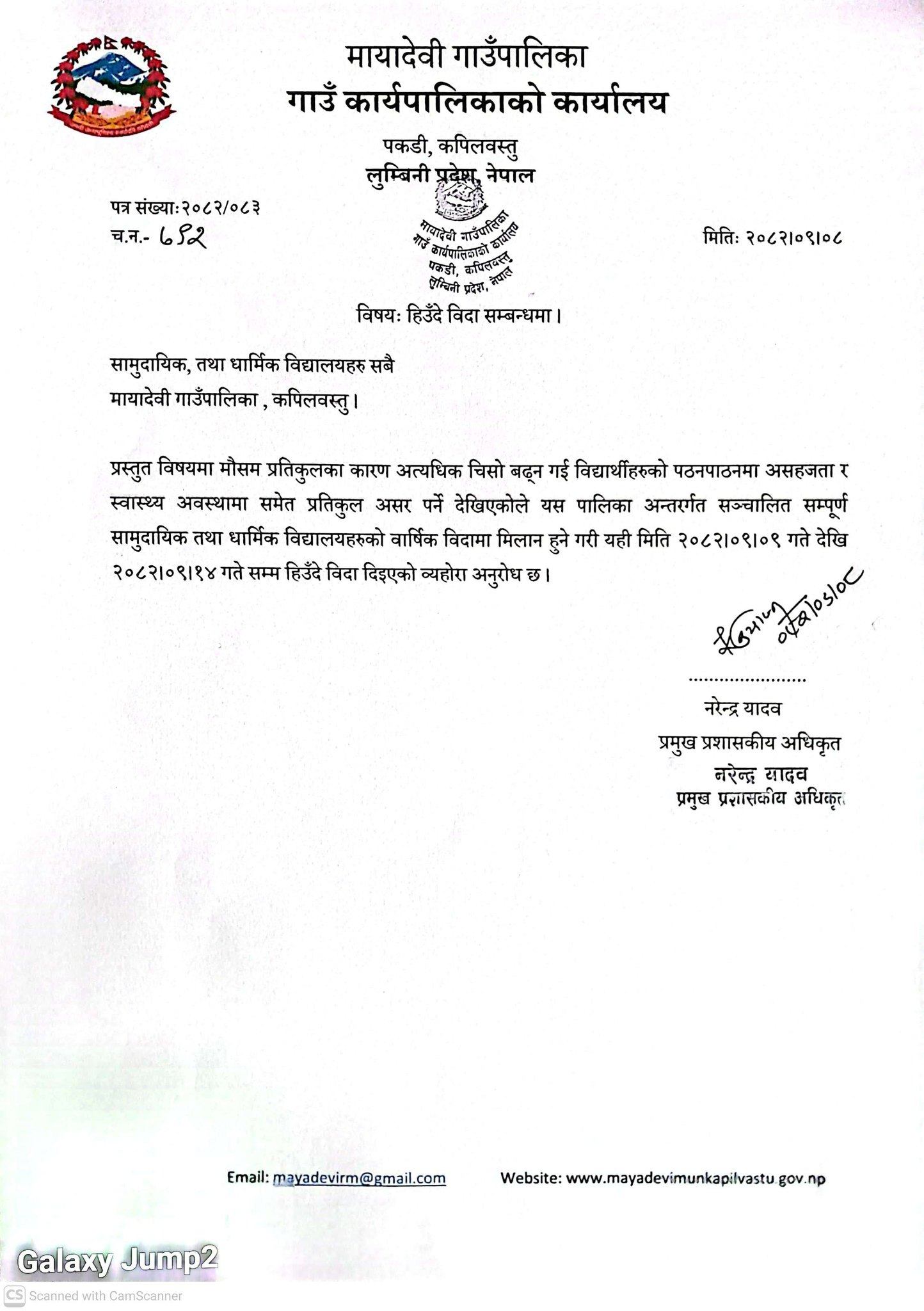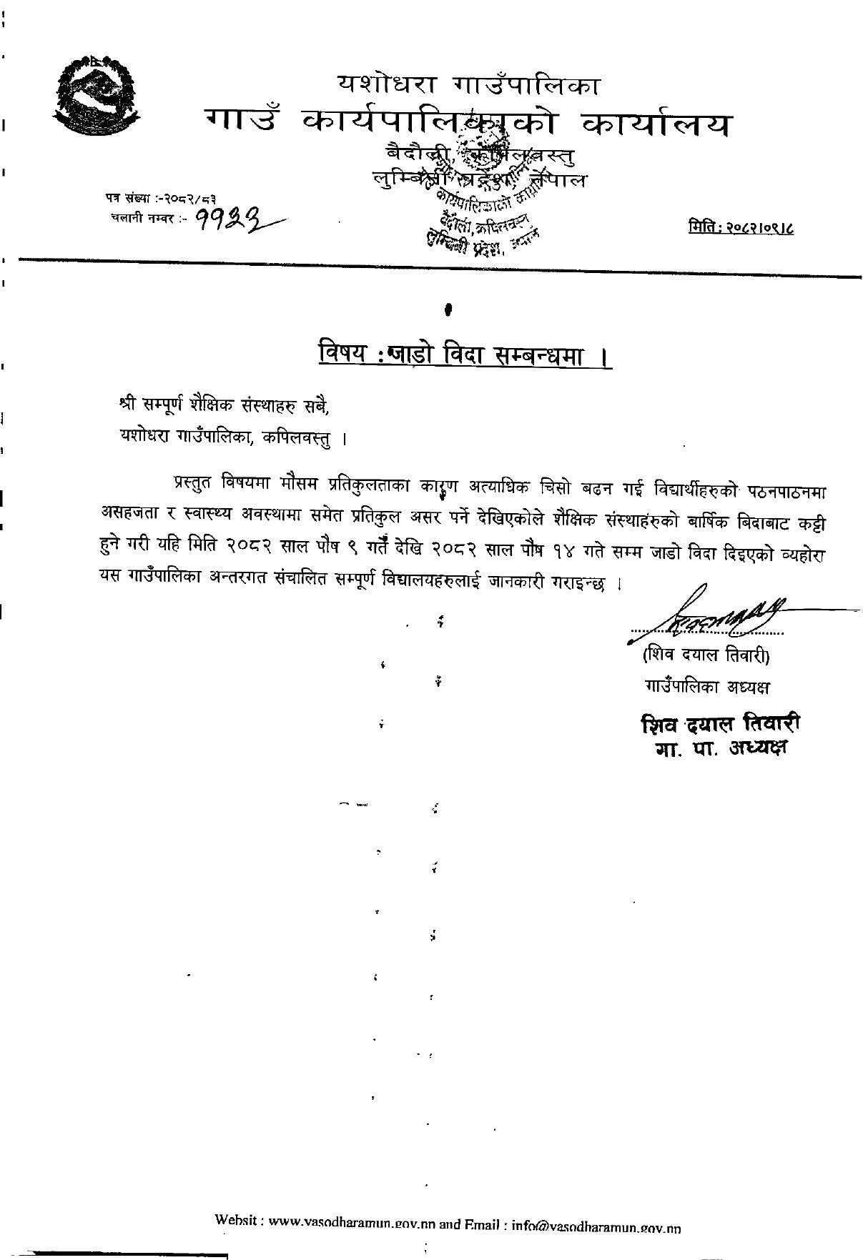 त्यस्तै यशोधरा गाँउपालिकाका प्रमुख प्रशासकिय अधिकृत नागेन्द्र यादवका अनुसार मौसम प्रतिकुलका कारण अत्यधिक चिसो बढेको कारणले पालिका अन्तरर्गत सञ्चालित सम्पूर्ण सामुदायिक तथा धार्मिक विद्यालयहरुमा पुस १४ गते सम्म जाडो विदा दिइएको बताउनुभयो ।