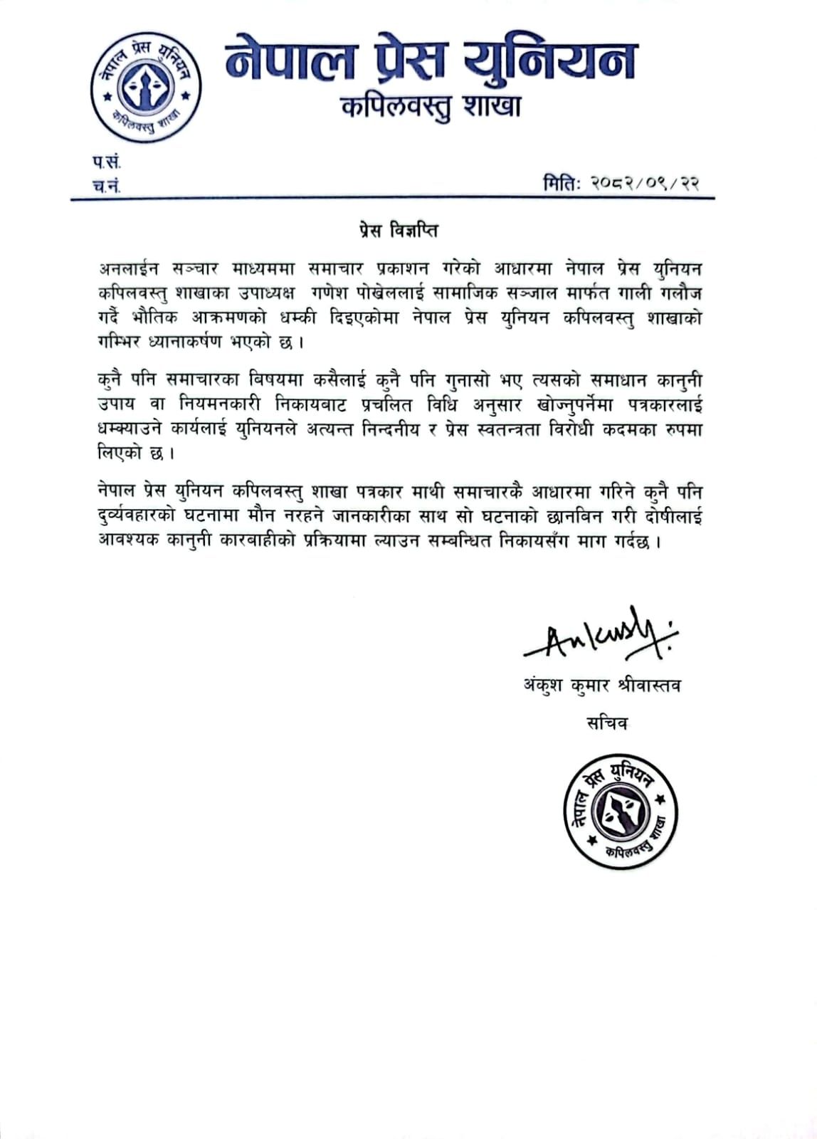 कपिलवस्तु, पुस २२ । अनलाइन सञ्चार माध्यममा प्रकाशित समाचारका कारण नेपाल प्रेस युनियन कपिलवस्तु शाखाका उपाध्यक्ष गणेश पोखरेललाई सामाजिक सञ्जालमार्फत गालीगलौज गर्दै भौतिक आक्रमणको धम्की दिइएको घटनाप्रति नेपाल प्रेस युनियन कपिलवस्तु शाखाले गम्भीर आपत्ति जनाएको छ।
