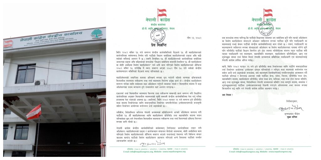 पदाधिकारी वा सदस्यहरूले व्यक्तिगत रूपमा बोलाइएको अधिवेशन वा विशेष महाधिवेशनका नाममा गरिने कुनै पनि गतिविधि पार्टीको विधानविपरीत हुने हुँदा त्यस्ता गतिविधिमा संलग्न नहुन पार्टी पंक्तिलाई अपिल गरिएको छ । विशेष महाधिवेशन पक्षधरले हिजो पत्रकार सम्मेलन गरी यही पुस २७ र २८ गते काठमाण्डौमा विशेष महाधिवेशन आह्वान गरेपछि कांग्रेस केन्द्रीय कार्यालयले यस्तो अपिल गरेको हो ।