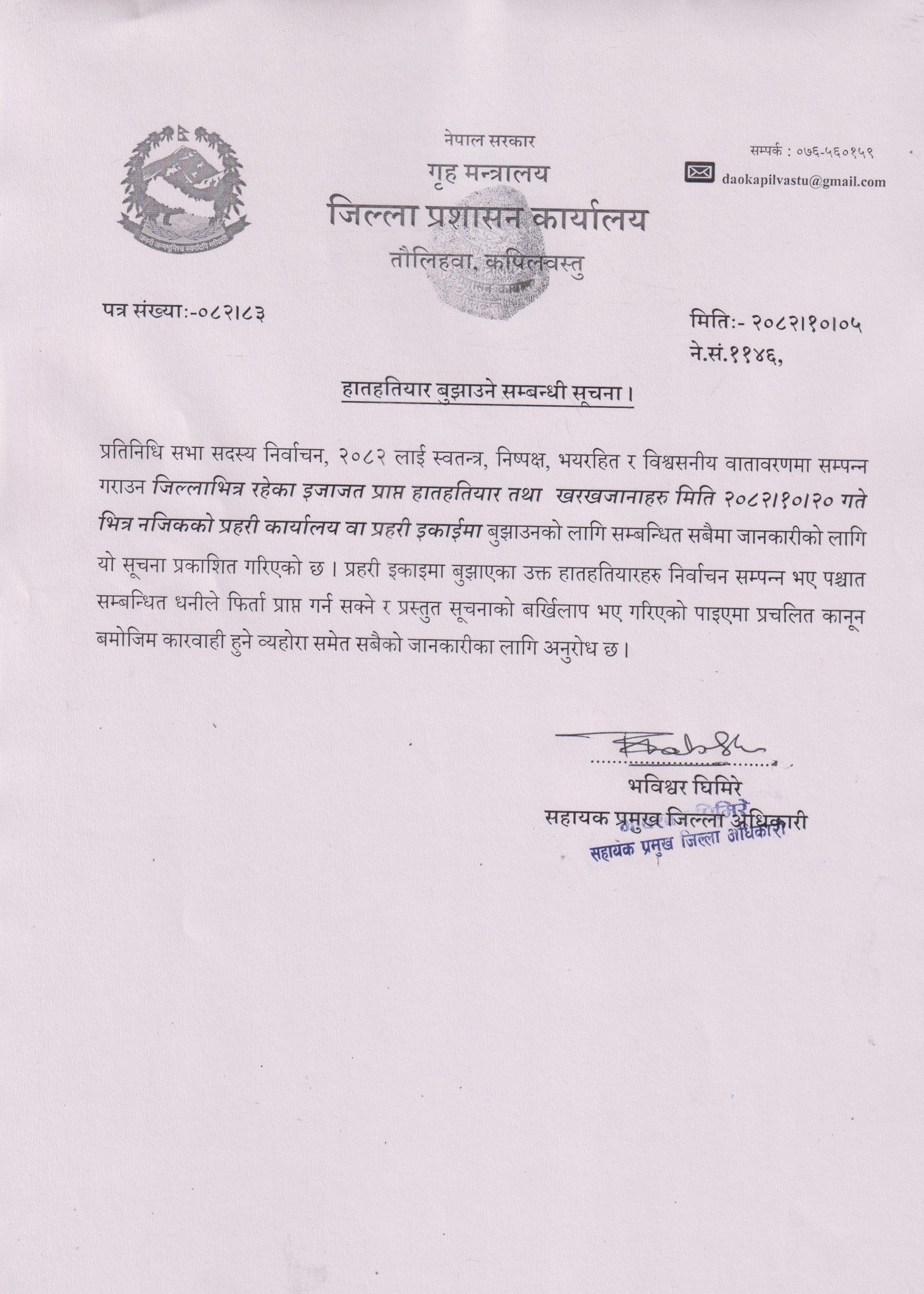 तौलिहवा(कपिलवस्तु), माघ ५ गते । जिल्ला प्रशासन कार्यलय कपिलवस्तुले निर्वाचनलाई लक्षित गर्दै हातहतियार बुझाउन निर्देशन दिइएको हो ।