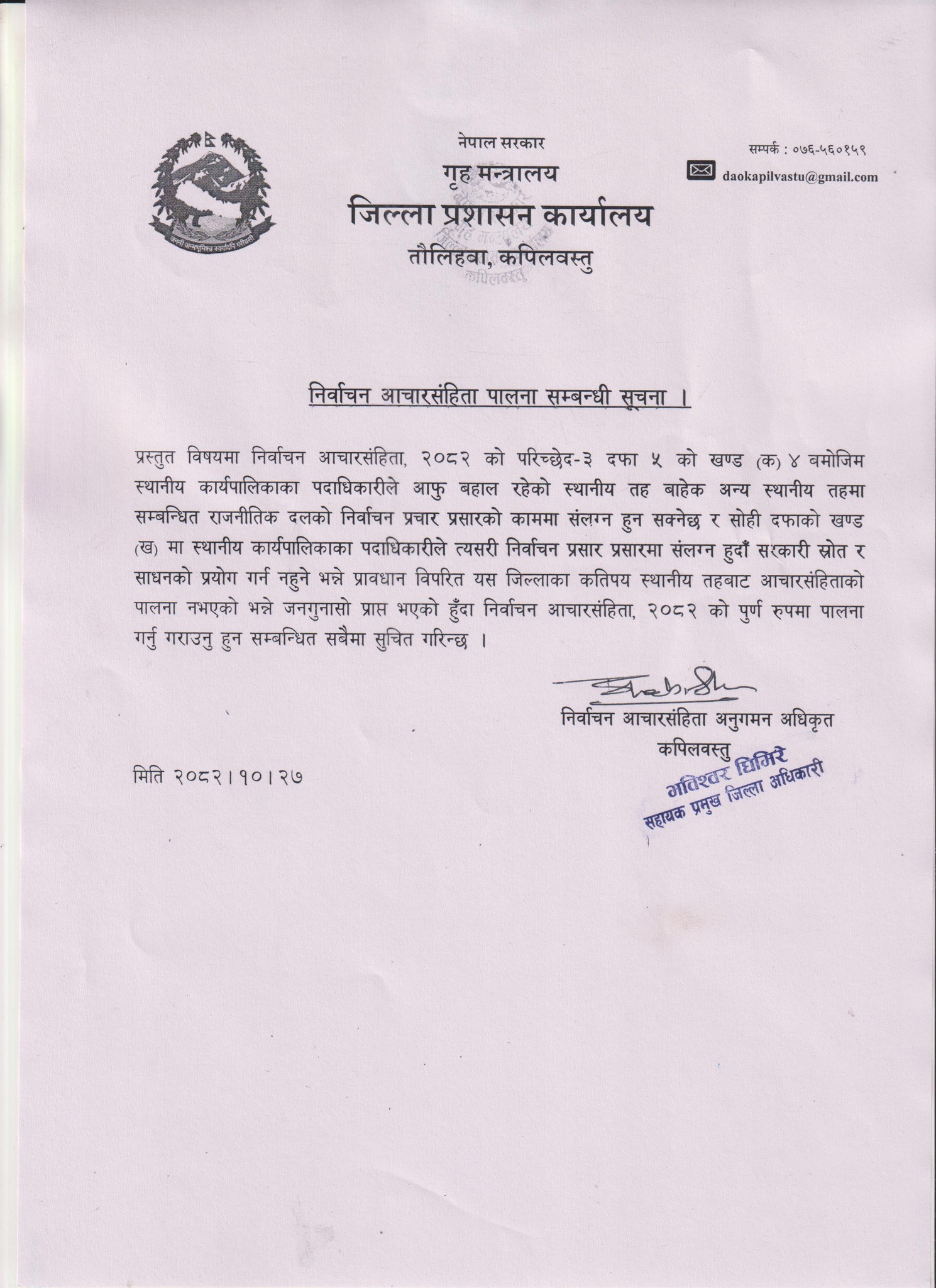 कपिलवस्तु । जिल्ला प्रशासन कार्यालय तौलिहवाले निर्वाचन आचारसंहिता, २०८२ को पूर्ण पालना गर्न सबै सरोकारवालालाई आग्रह गरेको छ। निर्वाचन आचारसंहिता, २०८२ को परिच्छेद ३ दफा ५ अन्तर्गत खण्ड ९(क) र ९(ख) विपरीत केही स्थानीय तहका पदाधिकारीहरूले आचारसंहिता उल्लंघन गरेको जनगुनासो प्राप्त भएपछि जिल्ला प्रशासनले ध्यानाकर्षण गराएको हो।
