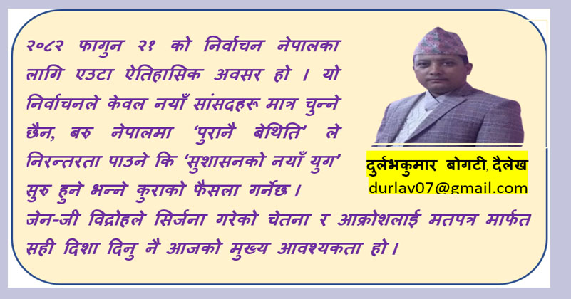 २०८२ फागुन २१ को निर्वाचन नेपालका लागि एउटा ऐतिहासिक अवसर हो । यो निर्वाचनले केवल नयाँ सांसदहरू मात्र चुन्ने छैन, बरु नेपालमा ‘पुरानै बेथिति’ ले निरन्तरता पाउने कि ‘सुशासनको नयाँ युग’ सुरु हुने भन्ने कुराको फैसला गर्नेछ । जेन-जी विद्रोहले सिर्जना गरेको चेतना र आक्रोशलाई मतपत्र मार्फत सही दिशा दिनु नै आजको मुख्य आवश्यकता हो ।