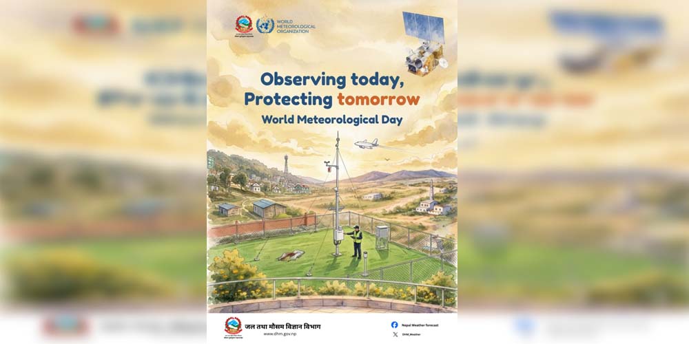 काठमाडौँ, चैत ९ गते । ‘आजको अवलोकन, भोलिको सुरक्षा’ भन्ने नाराका साथ नेपालमा पनि बिबिध कार्यक्रम आयोजना गरी विश्व जल तथा मौसम दिवस मनाइँदै छ । सन् १९५० मा विश्व मौसम विज्ञान सङ्गठनको स्थापना भएको दिनको सम्झनामा सन् १९६१ देखि यो दिवस मनाउन थालिएको हो ।