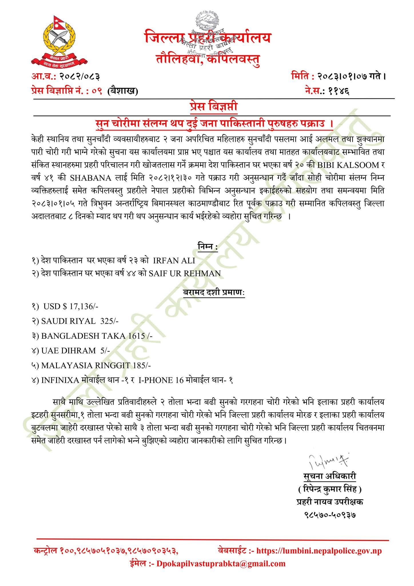 गत वैशाख १ गते चन्द्रौटामा पक्राउ परेका महिलासँग सोधपुछपछि सुन चोरी गर्ने गिरोहमध्ये थप दुई जना पाकिस्तानी पक्राउ परेका हुन्। गत चैत १ गते कपिलवस्तुको शिवरानगरपालिकाको चन्द्रौटास्थित सुरेन्द्र सुनचाँदी पसलमा सुन चोरको आरोपमा दुई पाकिस्तानी महिला पक्राउ परेपछि प्रहरीले अनुसन्धानका क्रममा सोही गिरोहका थप दुई पाकिस्तानी पक्राउ परेका हुन्।
